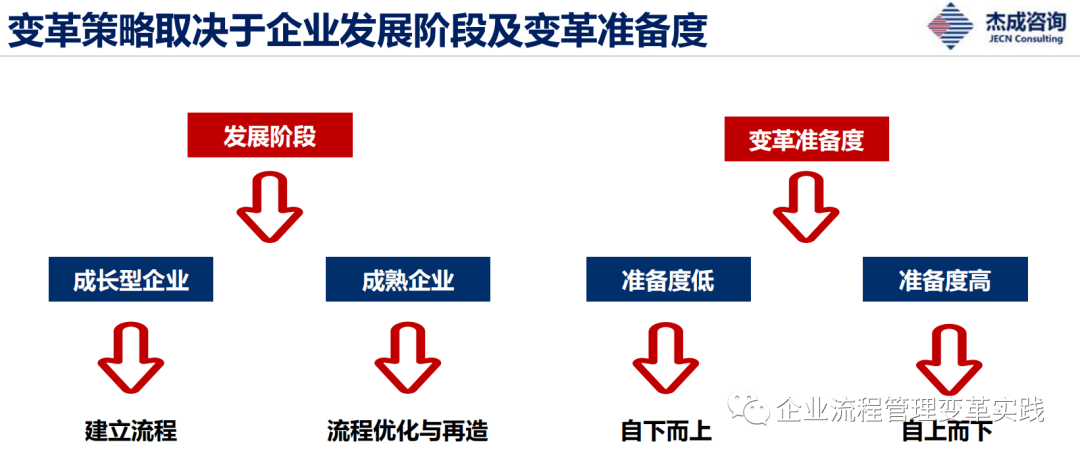 企业在不同的发展阶段,以及不同的变革准备下都会产生不同的变革策略。所以我们要看一下,我们的企业当前处于什么发展阶段。比如说成长期的企业和成熟期的企业,变革的策略就不一样。对于一个从创业期步入成长期的企业,首先要做管理转型。从过去依赖企业家精神和个人英雄,到培育组织的能力,那么流程首先要解决从无到有的问题。这个阶段,要培育整个组织流程规则意识和尊重意识。也许制定的流程不是最佳的,但可以通过尊重以后再去持续优化。但是对于上了规模的成熟期的企业,最大的问题和挑战就是大公司病。组织对市场需求的反应和交互的效率,以及运营成本都存在很大的问题。所以这就需要通过一些流程的优化和建造来解决这些问题,因为组织的流程太臃肿、并且碎片化协同断点多。所以在企业不同的发展阶段,有不同的变革策略。