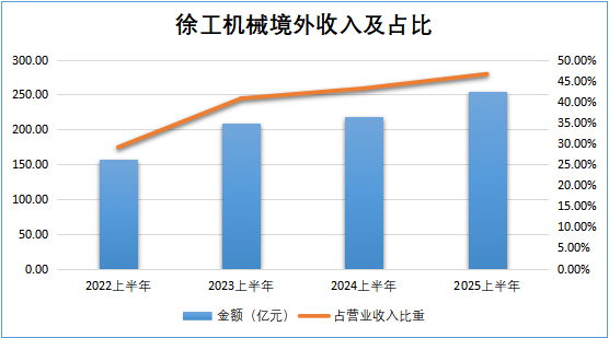 今年上半年,在凯发k8一触即发机械548.08亿元收入中,海外收入255.46亿元,同比增长16.64%,海外收入占比自2022年中报的29.07%至上年同期的43.17%,进一步提升至46.61%,3年来稳步提高。
