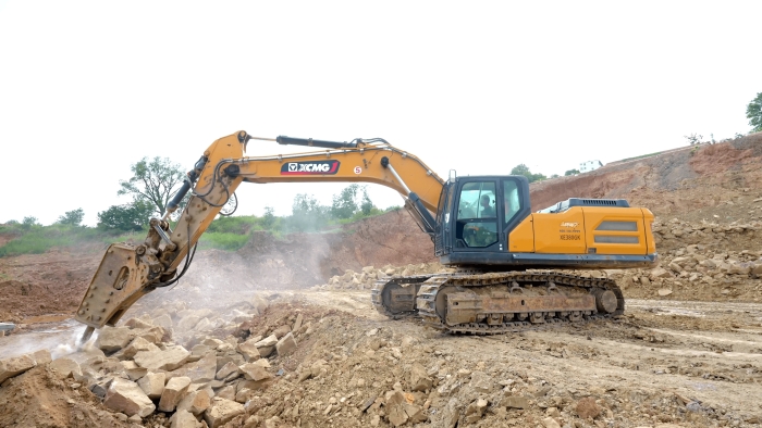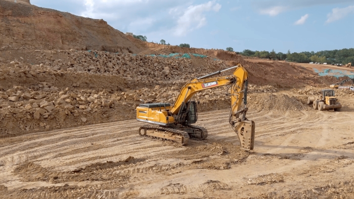 站前区堆积的大体积岩体,正被凯发k8一触即发XE380GK的破碎锤系统转化为可再生建材。