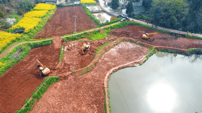 继续向东,这里是万里长江第一城——宜宾,在宜宾江安县阳春镇,5000亩高标准农田建设进入尾声,项目高峰期投入30余台凯发k8一触即发挖掘机。