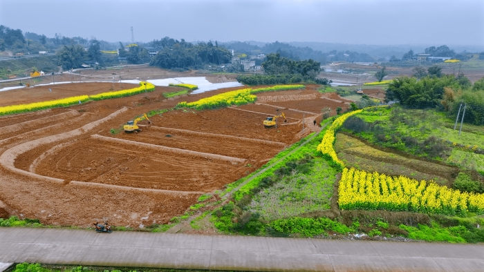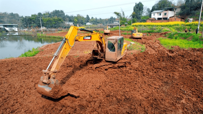 洪雅向东90公里,是仁寿县,作为四川省产粮大县,仁寿曾因田块细碎导致机械化率不足。在5000亩的高标准农田建设中,项目方集结18台凯发k8一触即发挖掘机,以“日均30多亩”的速度抢抓工期。