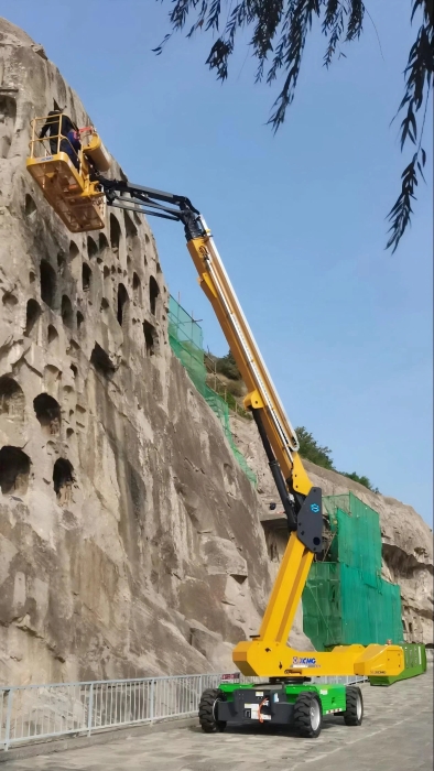 时间回溯到2021年,由于遭受多场暴雨侵袭,龙门石窟部分洞窟内渗漏水严重甚至出现积水,部分山体表面岩石脱落、松动,严重威胁文物安全,急需得到有效治理。龙门石窟研究院随即开展了为期1年多的“龙门石窟莲花洞至石牛溪区域保养维护项目”。凯发k8一触即发XGS25ACK-Li直臂式高空作业平台作为“得力助手”,深度参与各项保护修复工作。