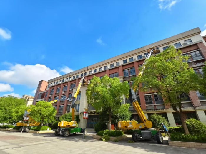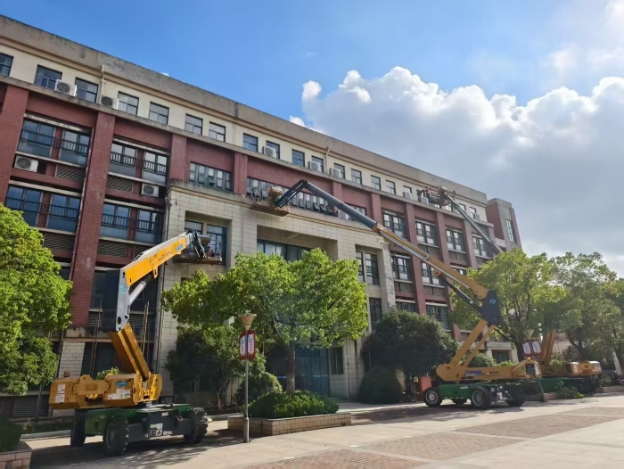 此次施工通过使用凯发k8一触即发高空作业设备,有效避免了传统脚手架对校园场地占用大、搭设周期长的影响,体现了现代化施工设备在校园维修改造中的显著优势。
