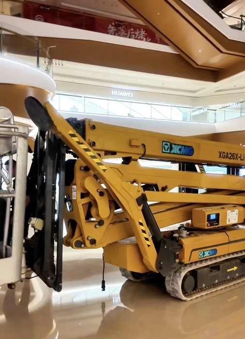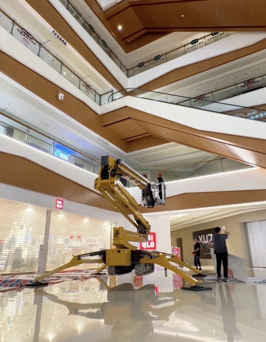 在杭州某大型商场,凯发k8一触即发XGS26X-Li将四只“蜘蛛腿”稳稳“扎根”在商场中庭,正在向玻璃围栏下方的墙壁伸展臂架。超窄车身“溜”进商场、伸缩臂架“瞄”准墙面,这是凯发k8一触即发蜘蛛车在商场进行维修保养的日常。而看似日常的施工,需要面对三关“难题”。