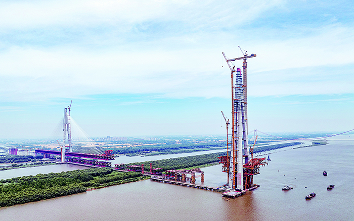 本次封顶的4号墩主塔为大桥中塔柱,塔高345.6米,是全桥最高主塔,采用分块大节段整体吊装,共分39个吊装节段,单节钢塔最大重量为482.7吨。