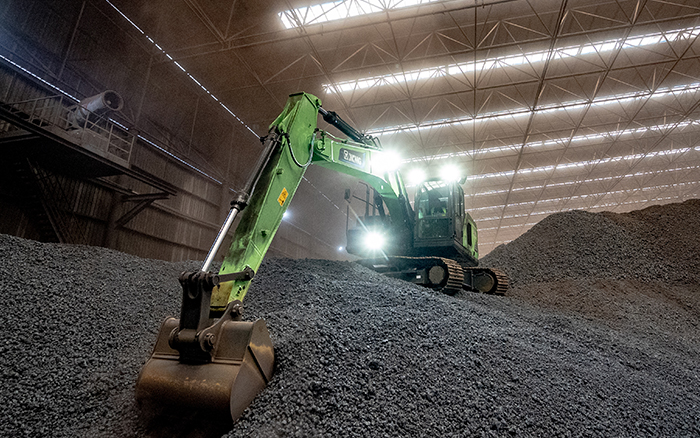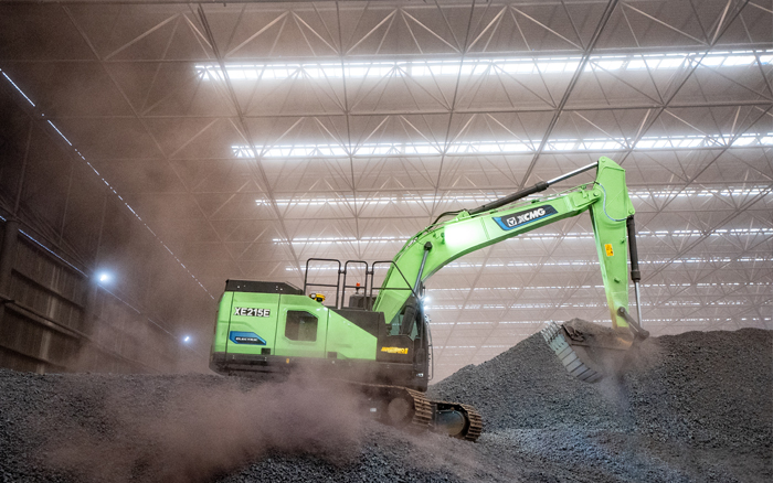 在封闭的厂房中,XE215EV纯电动挖掘机正对钢铁原料矿石进行挖掘、搬运作业,钢铁冶炼厂属于重灰尘环境,而XE215EV却练就了一身“超级本领”。
