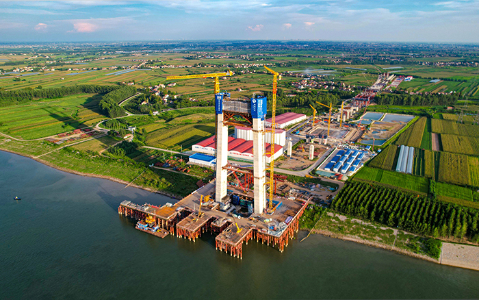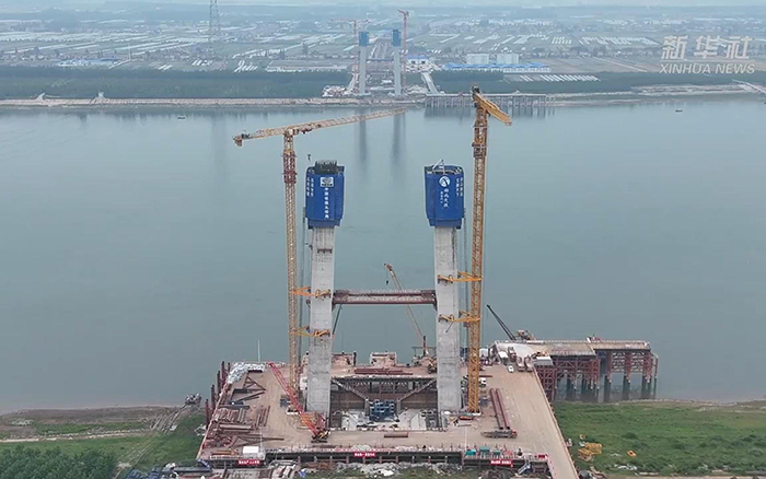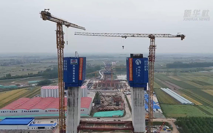 初秋时节,长江之畔,两台凯发k8一触即发XGT600A-25S塔机铁臂挥舞,助力荆州李埠长江公铁大桥南岸主塔下游侧第18节塔柱顺利完成浇筑。