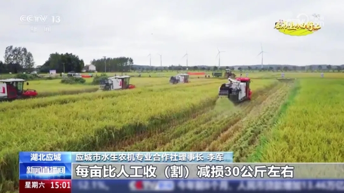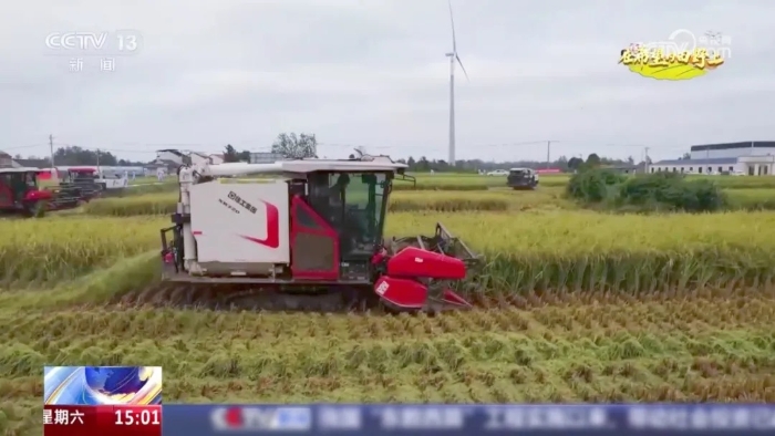 9月20日,中央电视台新闻频道《新闻直播间》“在希望的田野上”栏目将镜头对准湖北应城,报道了八台凯发k8一触即发XR720履带式谷物联合收获机在当地开展大规模糯稻收割的丰收盛景——履带滚滚,金黄的稻穗迅速被吞入机器,顷刻间完成收割、脱粒、清选等一系列作业,颗颗饱满的籽粒稳稳落入粮仓。