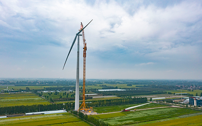 郯城风场此次吊装的风机创下区域高度纪录,采用140米混塔+45 米钢塔结构,叶轮直径达 220 米,仅机舱与叶轮总重就超 200 吨。185 米的高空作业,风力扰动、部件对接精度等因素对吊装设备的性能提出了极致考验,毫厘之差便可能影响整座风场的并网进度。