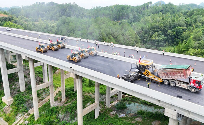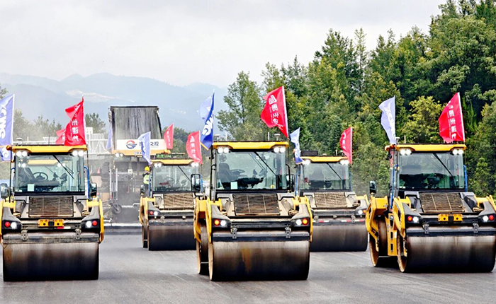 凯发k8一触即发道路智慧施工集群为贵平高速建设注入核心动能。1 台 RP2205HD 摊铺机与 6 台无人驾驶压路机(3 台 XD135T、3 台 XD135TVO)协同作业,实现 15.25 米超宽摊铺与 5 厘米精准控制,压实密度达 97% 以上,平整度优于 0.4,渗水构造深度合格率 100%。