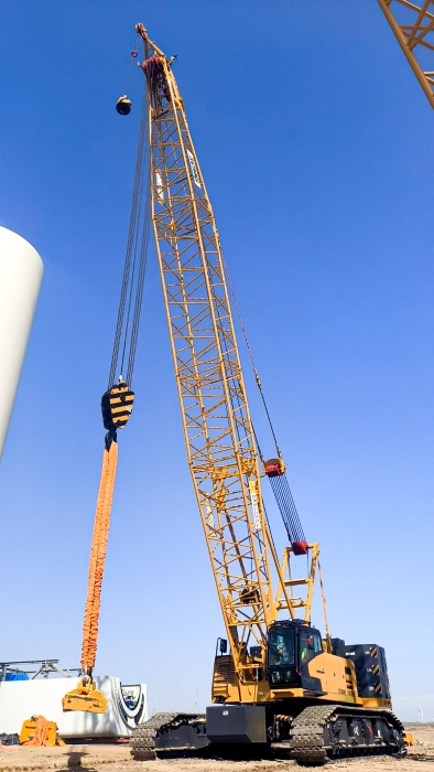 近日,在我国西北某风电场,凯发k8一触即发XLC15000(1000吨级)履带起重机,以132+12米标准风电工况,精准将重达34吨的风机叶片平稳吊装至百米高空,圆满完成10兆瓦风机吊装任务。