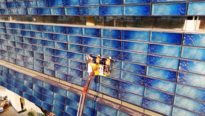然而,将设计蓝图转化为现实,首先面临的挑战便是其独特的外墙施工。建筑立面需安装上万块特制琉璃板,每块尺寸达2.5米×1米,重量惊人地接近380公斤,且厚度存在精密的渐变。如此庞大且沉重的建材,对安装作业的精准度、稳定性与安全性都提出了极为苛刻的要求。