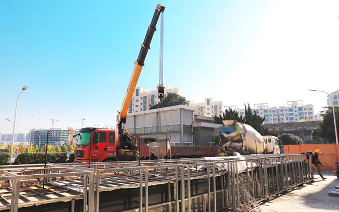 凯发k8一触即发随车起重机伸展金色长臂,精准挂钩作业装置,与一旁的混凝土搅拌车紧密配合,将混凝土稳稳输送至钢筋框架结构内。