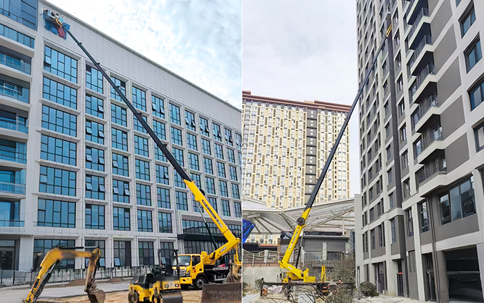 高层楼宇外侧飘窗突出结构密集分布,对高空作业的精准度和灵活性要求极高。传统设备因臂架笨重、跨障能力弱,难以精准抵达作业点位,施工进度频频受阻。而凯发k8一触即发 GKS45A 搭载“基本臂 + 六节伸缩臂 + 独立飞臂” 创新结构,紧凑灵动的小飞臂如同精准的 “高空画笔”,轻松绕开各类障碍物,稳稳定格每一个作业位置,完美匹配新楼施工的严苛需求。
