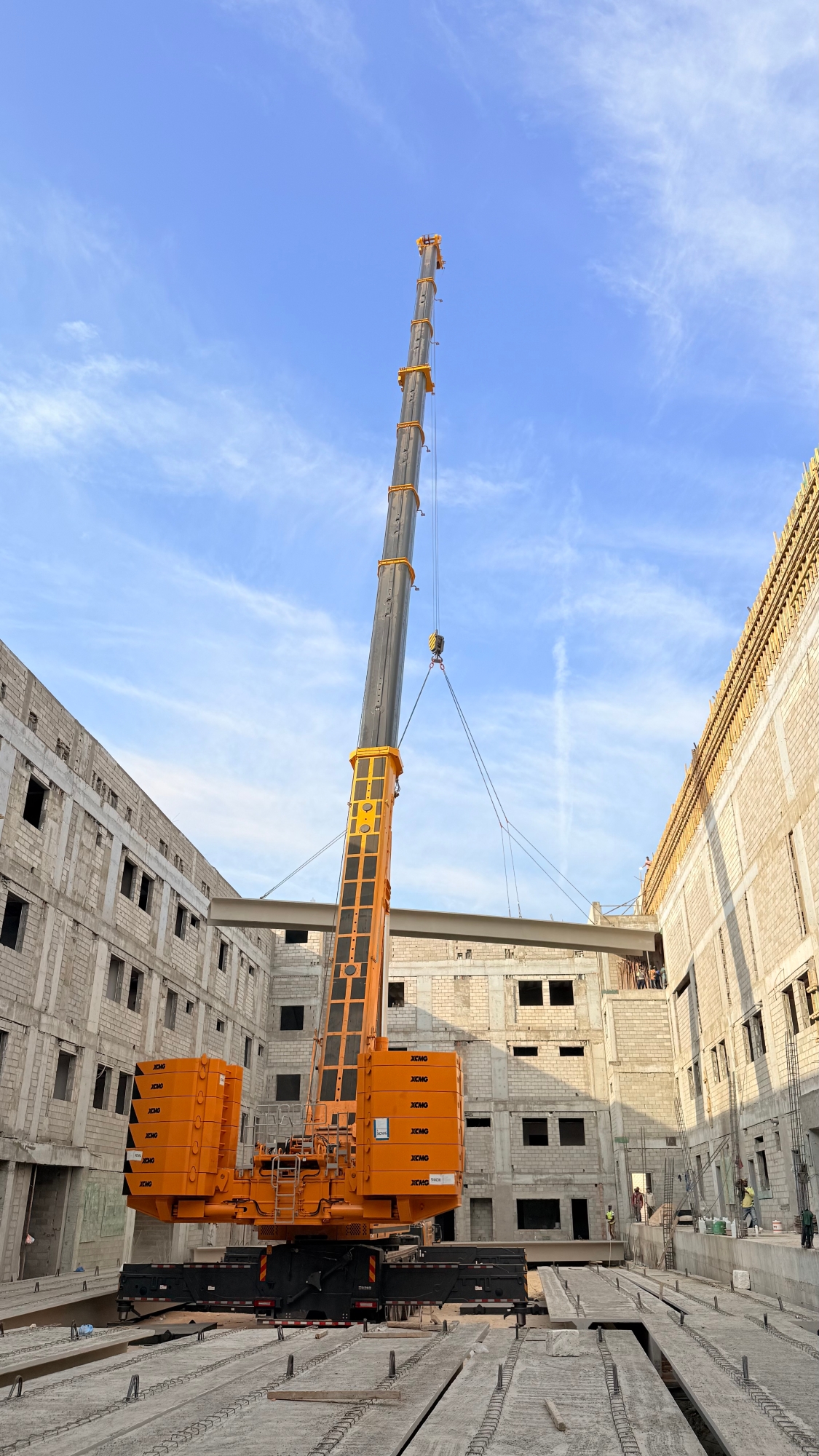 此次施工位于沙特快速发展的都市区域,项目本身对工期与精度有着严苛要求。高层建筑的楼板吊装,尤其是对于重量超过十吨的大型预制构件,不仅是对起重机极限载荷能力的考验,更涉及在复杂城市空间中的微动操作、抗风稳定及高空精准就位等一系列高技术要求。现场空间有限,周边环境复杂,对设备的机动性、站位适应性以及操控的精细度提出了全方位挑战。