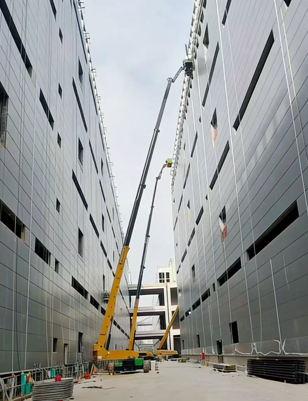 面对这场“高空攻坚战”,凯发k8一触即发多台XGS58K与XGS52ACK-Li高米数直臂式高空作业平台组成“钢铁舰队”震撼登场。58米的极限作业高度轻松覆盖物流仓库外立面钢结构安装、幕墙铺设及机电系统施工的每一处高点;而搭载锂电池系统的XGS52ACK-Li则以零排放、低噪音的绿色优势,在密闭空间和夜间施工中游刃有余,实现了续航长、能耗省、环保达标的完美平衡。设备凭借灵活的臂架设计和精准的微动性能,在纵横交错的钢构之间自如伸展,助力建设者如同“搭积木”般高效完成高空作业。